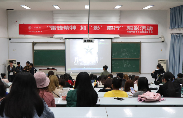 2018年是毛泽东同志发出“向雷锋同志学习”号召的第56周年,传媒学院公益部利用特色晚自习的时间在正心楼02阶梯教室播放影片《雷锋》。在正式观影前,公益部的干事邹佳杰为在场的同学们简述了雷锋的一生,进而引出雷锋精神。观影过程中,现场秩序良好,同学们的注意力都集中在影片当中,教室里一片寂静。