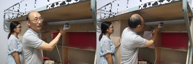 走访过程中,领导老师们用幽默的相处方式给毕业生们留下了温馨的回忆。韦院长在看到毕业生很难清理书桌上剩下的墙纸时,给毕业生们介绍了一个小窍门并和黄智老师一起示范:“用吹风机顺着边吹一下就会很好撕下来。”毕业生们纷纷表示学到了新技能,还和韦院长打趣道:“以后的出租屋装修不用愁了,看来要向韦院长学习的地方还有很多呀。”