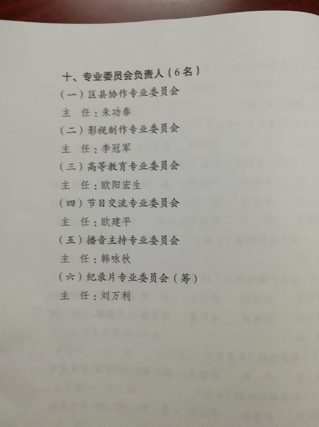据悉,重庆市广播电视协会下辖六个专委会,分别是区县协作专业委员会(主任:主功春),影视制作专业委员会(主任:李冠军),高等教育专业委员会(主任:欧阳宏生),节目交流专业委员会(主任:欧建平),播音主持专业委员会(主任:韩咏秋),纪录片专业委员会(主任:刘万利)。