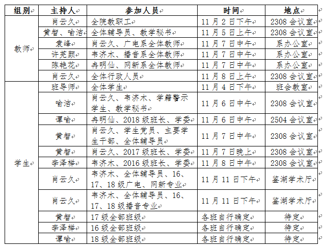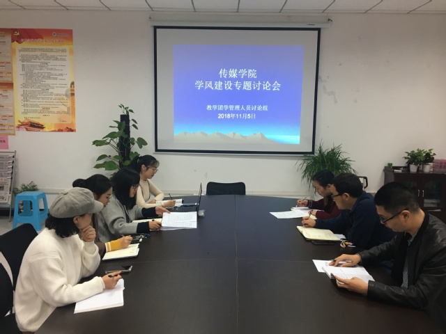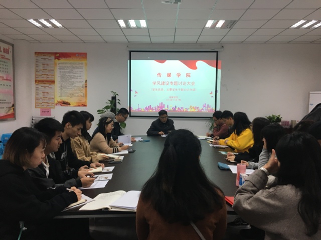 2018年11月11日,传媒学院学风建设动员大会在鉴湖学术厅召开,学院院长韦济木、党总支书记肖云久、党政办主任喻洁、学工办主任黄智、广电系主任袁峰、播音系主任许芫颜、网新系主任陈艳花、辅导员李泽榉、谭喻出席会议,2016、2017、2018级全体学生到场参加,大会由肖云久书记主持。