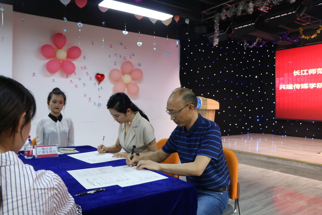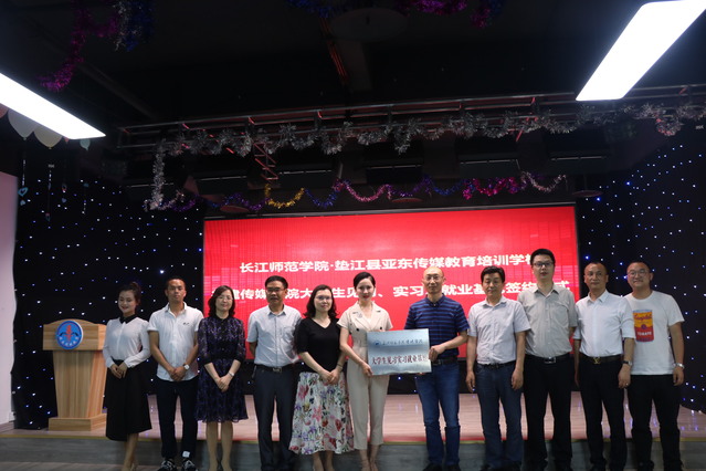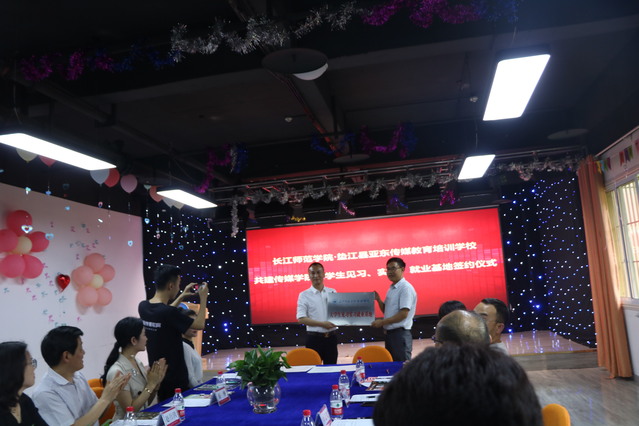 最后,由韦济木院长和尚博校长签署长江师范学院、垫江县亚东传媒教育培训中心共建传媒学院大学生见习、实习、就业基地合作协议书;由肖云久书记为“长江师范学院传媒学院大学生见习、实习就业基地”授牌。