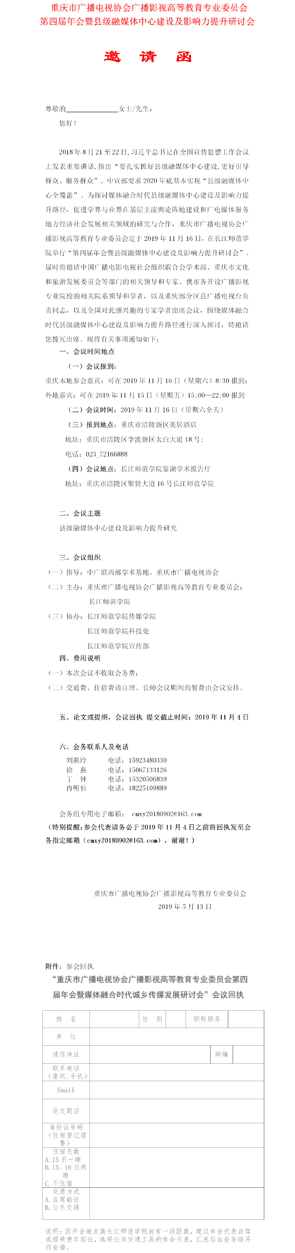 重庆市广播电视协会广播影视高等教育专业委员会第四届年会暨县级融媒体中心建设及影响力提升研讨会邀请函