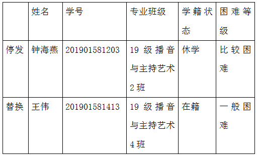 根据国家助学金发放规定,存在休学情况的需停发助学金,对应助学金可按要求和程序评选给其他有需要的困难学生。经学生个人申请、学院党组织会议和党政联席会研究决定,现将我院本学期需停发及替换名单公示如下,公示期3.5-3.9,如有异议,请联系学院辅导员办公室72793557。