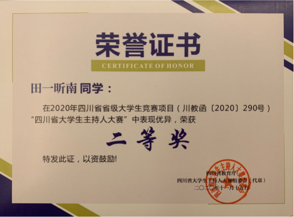 四川省大学生主持人大赛获奖证书