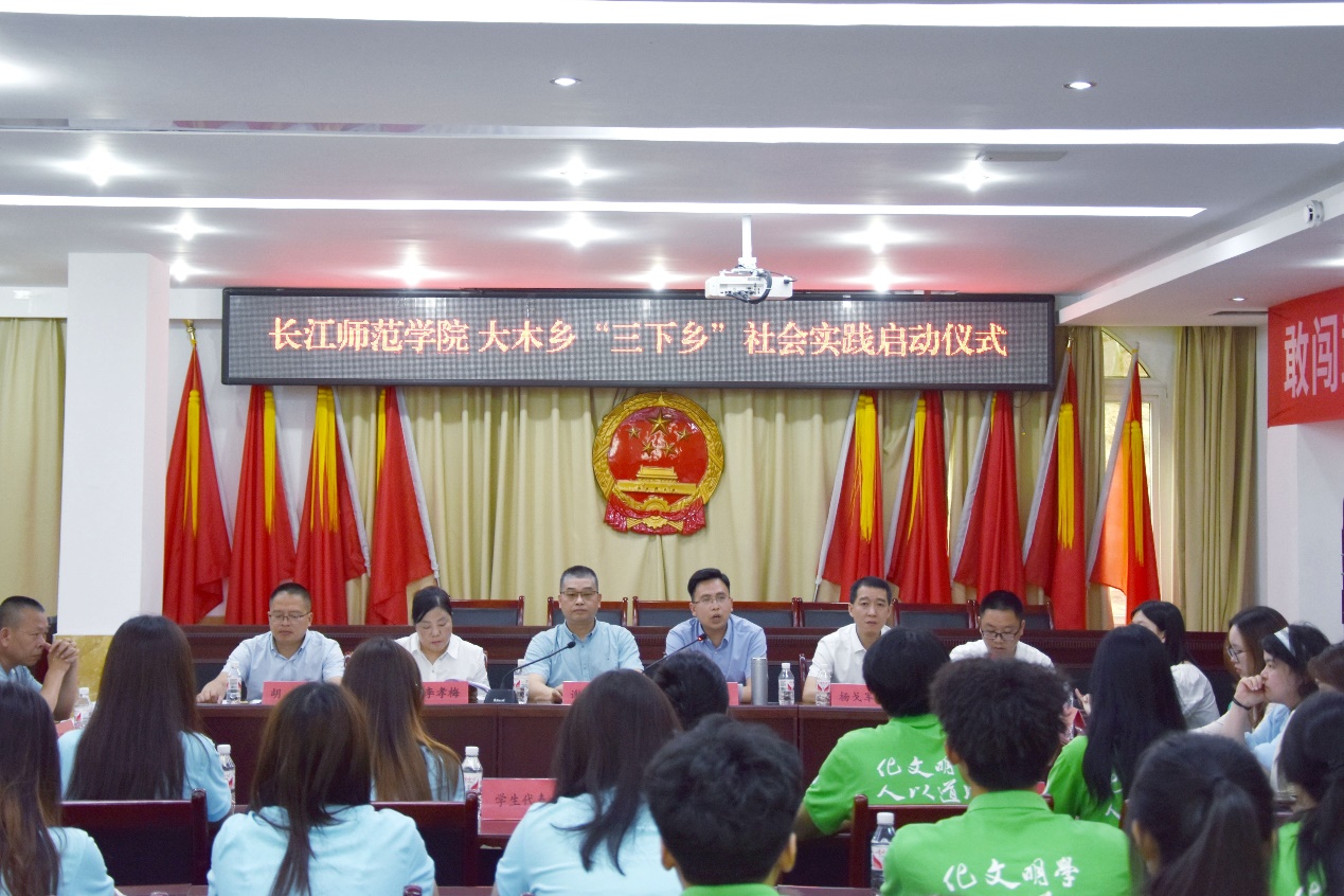 (通讯员 张惠婷/文 房嘉奕/图)7月8日上午,长江师范学院文学院与传媒学院同涪陵区大木乡举行暑期“三下乡”社会实践基地签约授牌仪式暨启动仪式,仪式于大木乡镇府二楼会议室举行。大木乡党委副书记、乡长龙明军,党委委员、人大主席李孝梅,乡政府相关部门负责人,文学院党委书记谢诗茂,传媒学院党委副书记杨戈军,相关带队指导教师及学生志愿者参加仪式。大木乡党委委员、组织委员董安仁主持仪式。