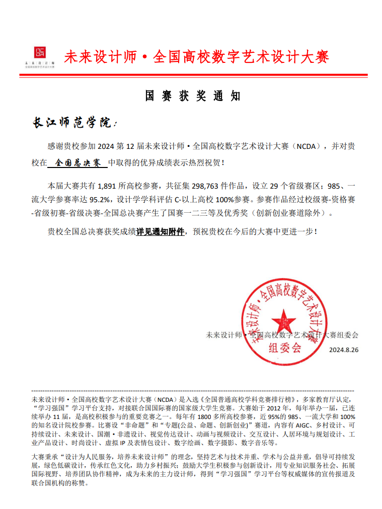 我校传媒学院、美术学院、机器人工程学院等多个学院学子的优秀作品,在众多参赛作品中脱颖而出,在全国总决赛中获一等奖3项、二等奖4项、三等奖7项。国赛一等奖获奖数量实现了新的突破。在重庆赛区荣获一等奖11项、二等奖19项、三等奖32项。长江师范学院荣获国赛“杰出组织奖”和重庆赛区“优秀组织单位”。