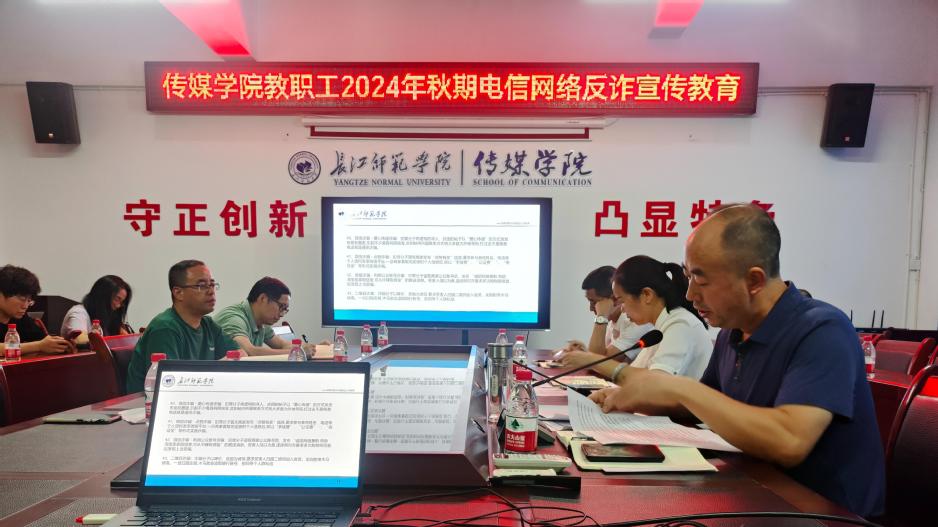 为了深入宣传和贯彻国家关于加强网络安全教育和防范电信网络诈骗的通知精神,提升教职工的防诈意识,营造安全稳定的工作环境,9月13日,传媒学院组织开展了教职工电信网络反诈宣传教育活动。宣传教育活动由学院党委副书记汪志平主持,传媒学院全体教职工参加了此项教育活动。