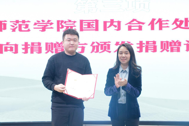 共建产业学院及捐赠仪式上,长江师范学院国内合作处处长谢艳为重庆越明年文化传媒有限公司颁发捐赠证书。