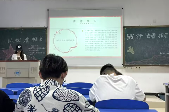 随后进入主题讨论环节,主讲人从习总书记视察重庆重要讲话回顾、五四青年节寄语精神解读、青年学生的责任与使命、挺膺担当的具体行动等方面详细学习习总书记视察重庆重要讲话重要指示和五四青年节寄语精神。通过此次环节,让青年们深刻认识到坚定维护“两个确立”坚决做到“两个维护”的重要性。