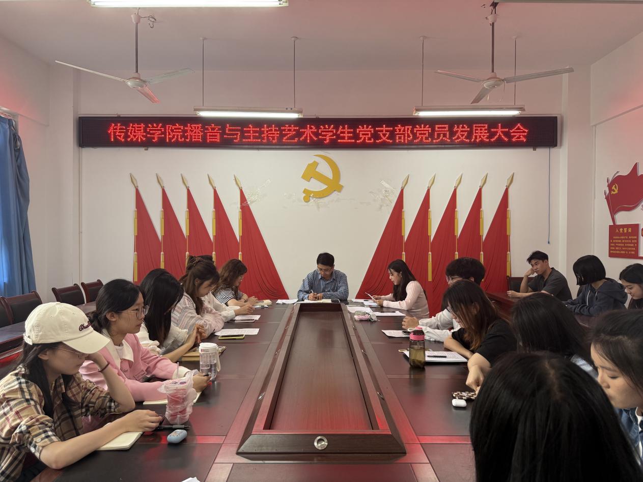 4月18日晚19:00,传媒学院播音与主持艺术学生党支部于格致楼2318会议室召开2025年4月党员发展大会。会议由支部书记简金雄主持,全体在校党员参加此次大会。