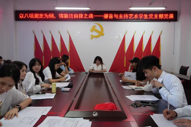 为深入学习贯彻党的二十大精神,加强学生党员的廉洁自律意识,筑牢思想防线。6月27日中午,传媒学院播音与主持艺术学生党支部于格致楼2318会议室开展了 “以八项规定为纲,铸廉洁自律之魂”主题党课。本次党课由党支部书记甘元琴主持,全体党员参加。