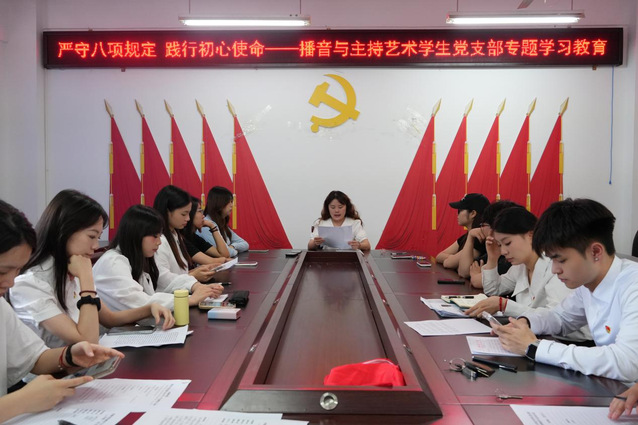 6月27日中午,传媒学院播音与主持艺术学生党支部于格致楼2318开展了以“严守八项规定,践行初心使命”专题学习教育。活动由党支部书记甘元琴同志主持,播音与主持艺术学生党支部全体党员参加。