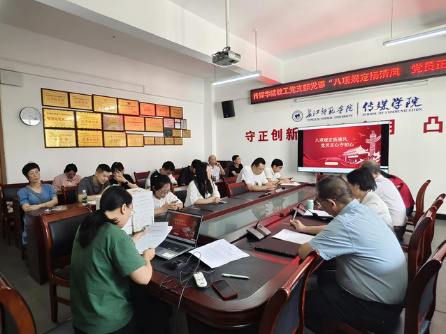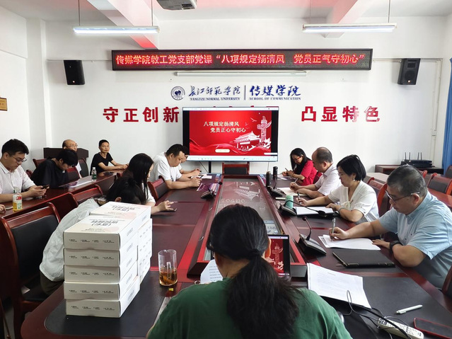 为深入贯彻落实全面从严治党要求,持续推进作风建设走深走实,6月27日下午3点20分,传媒学院教工党支部开展“八项规定扬清风,党员正心守初心”专题党课学习。本次党课由支部书记杨颖主讲,全体教工党员参加学习。