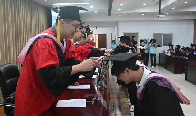 最受瞩目的学位授予环节,学院领导与教师代表依次为毕业生拨穗、授予学位证书,完成从学子到学士的身份转变。毕业生代表向教师献花致谢,典礼在全体齐唱校歌中圆满结束。