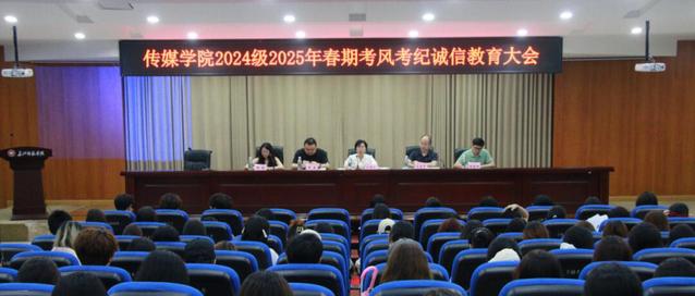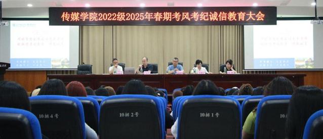 为了强化学生诚信意识、严肃考风考纪、营造风清气正的考试环境,6月22日下午,传媒学院在鉴湖学术报告厅开展2025年春期考风考纪诚信教育活动。传媒学院党委书记谢诗茂,院长冉明仙,副院长汪志平,学工办主任兼团委书记、2022级辅导员王雯,2023级辅导员姚瑜,2024级辅导员谭喻出席会议;2022级至2024级全体学生参与此次活动。