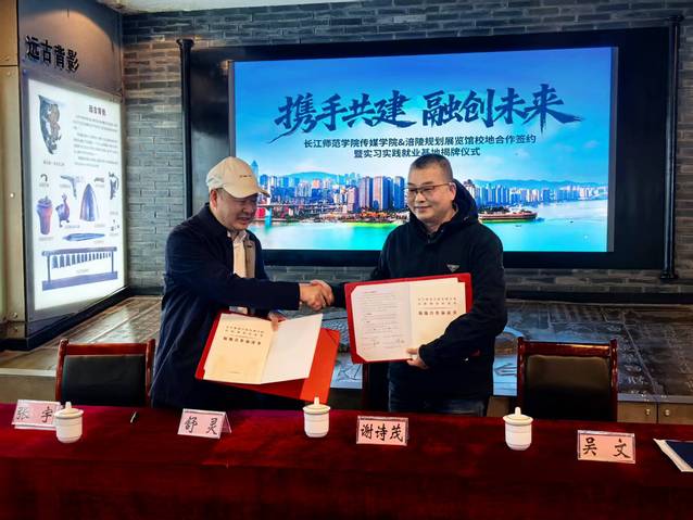 传媒学院党委书记谢诗茂介绍了传媒学院的发展历程、专业设置,近年来在学科科研、人才培养方面的成就和特色优势。他讲到,传媒学院始终坚持扎根地方、服务区域经济社会发展的宗旨,期待以此次校地合作签约暨实习实践就业基地揭牌为契机,将此次合作办为一个“高质量的‘实践练兵场’,高水平的‘教研赋能站’、高层次的‘文化传播台’”。建立长期、稳定、深入的合作关系,实现校地双方互利共赢,共同为区域经济社会发展贡献力量。仪式上,涪陵规划展览馆馆长舒灵与传媒学院党委书记谢诗茂签署校地合作协议。