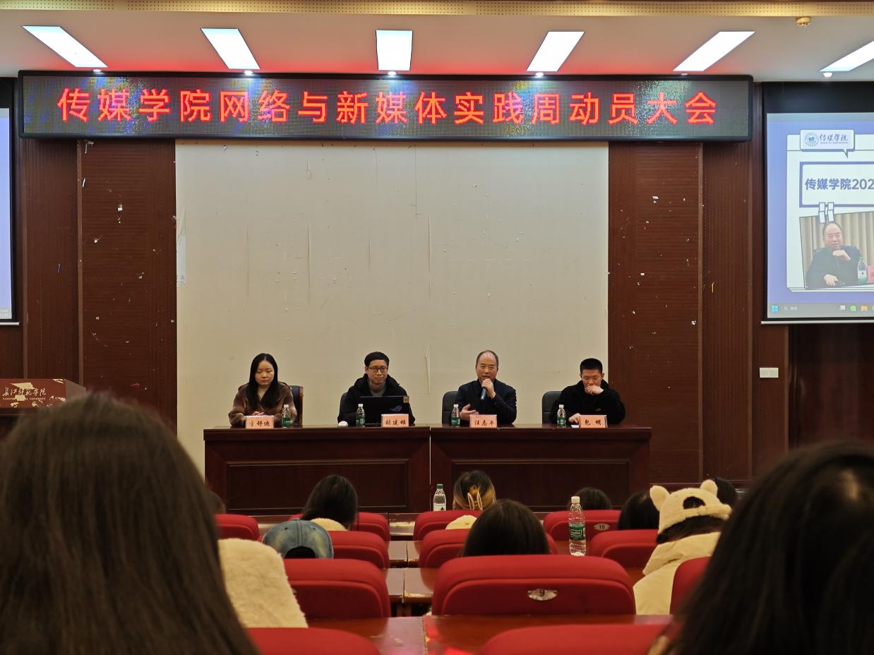 2025年11月30日15时,传媒学院网络与新媒体专业实践周动员大会在玉衡学术报告厅隆重召开。传媒学院副院长汪志平、网络与新媒体系主任张建雄、副系主任李舒迪出席会议,特邀重庆万读科技有限公司总经理包明莅临指导,网络与新媒体专业2023级、2024级全体学生参加此次动员大会。